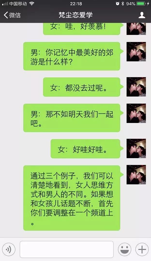 相信大家通过以上的对比可以看出,男性的思维方式很快就会把话题聊没了。而女性的思维方式注重分享彼此的感受,还可以谈论更多细节,这样你们聊天的时候话题不仅多了起来,而且让女人觉得你和她是在同一个频道,自然愿意和你聊下去。