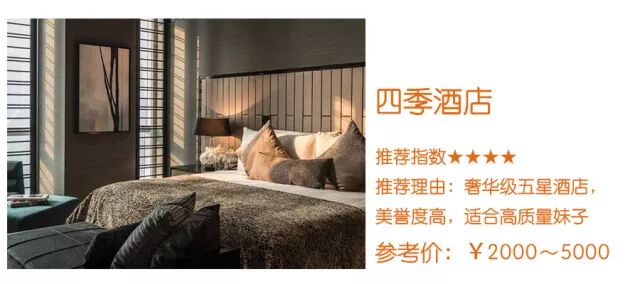 但妹子质量越高则越应该选择更高级酒店,妹子质量高除了颜值高,很多都见识“广”,你说我住四季和我住7天,结果能一样吗?