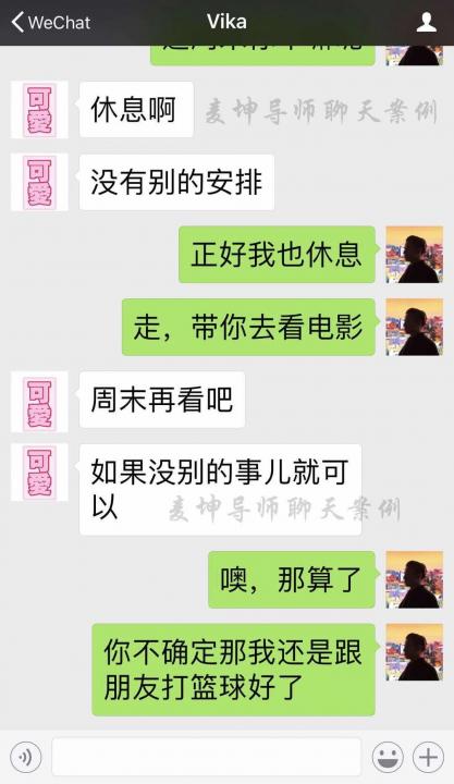 Vika:周末再看吧,如果没别的事儿就可以一起看电影。(强框架)